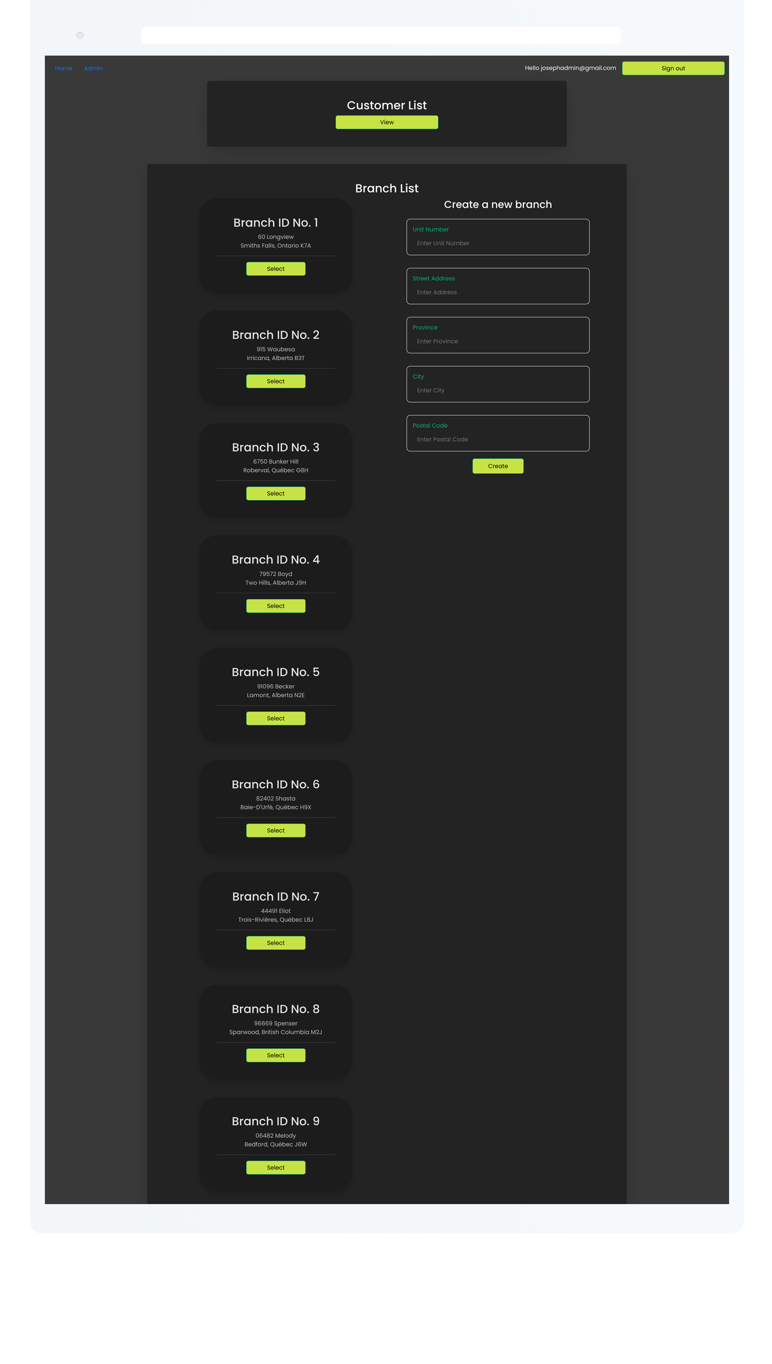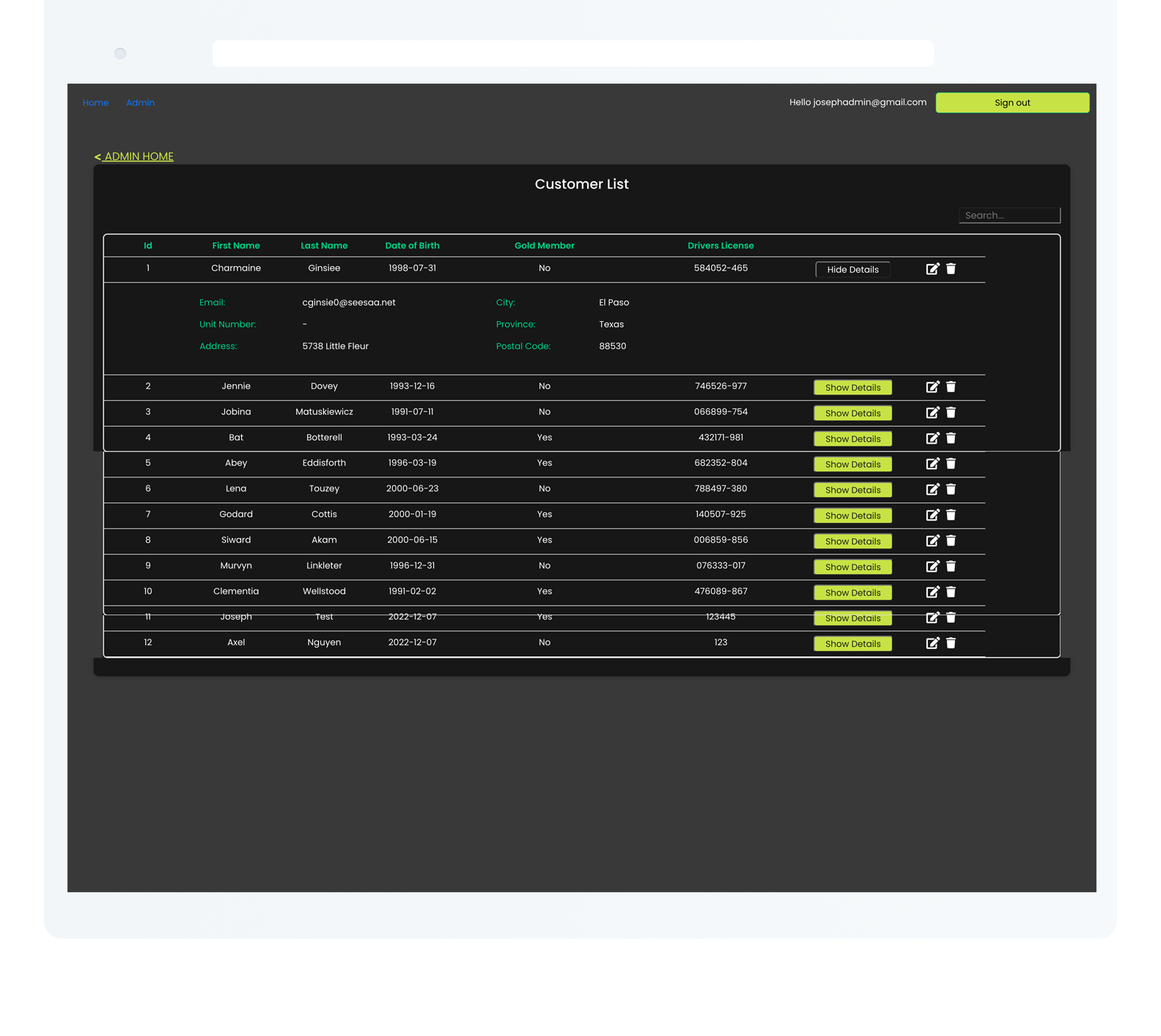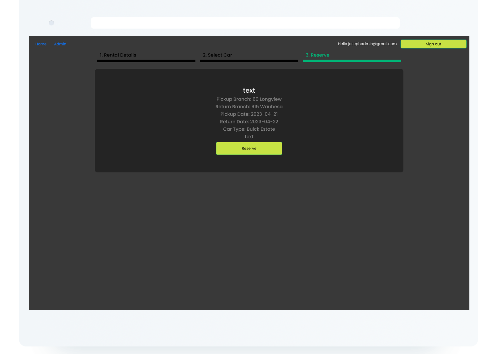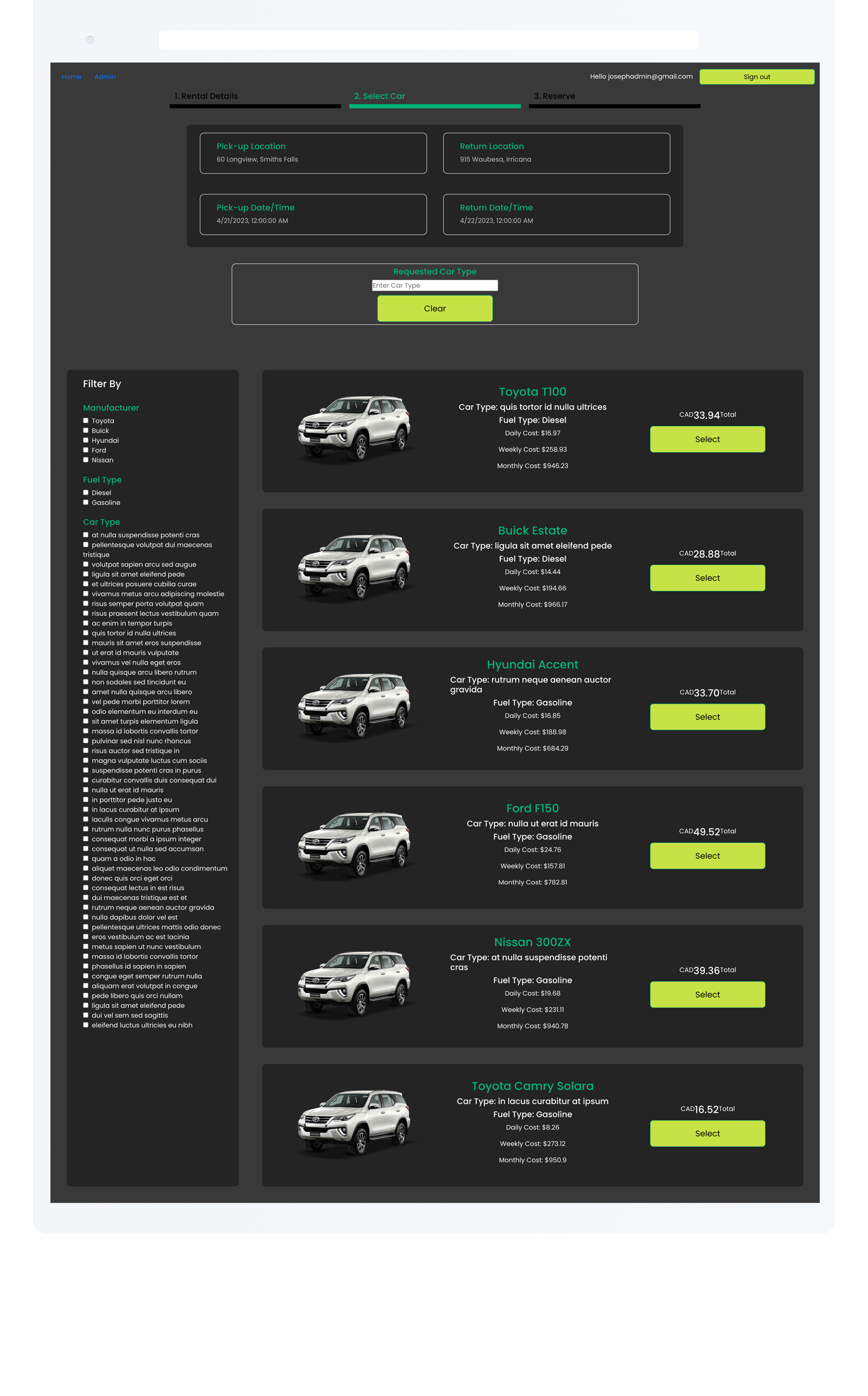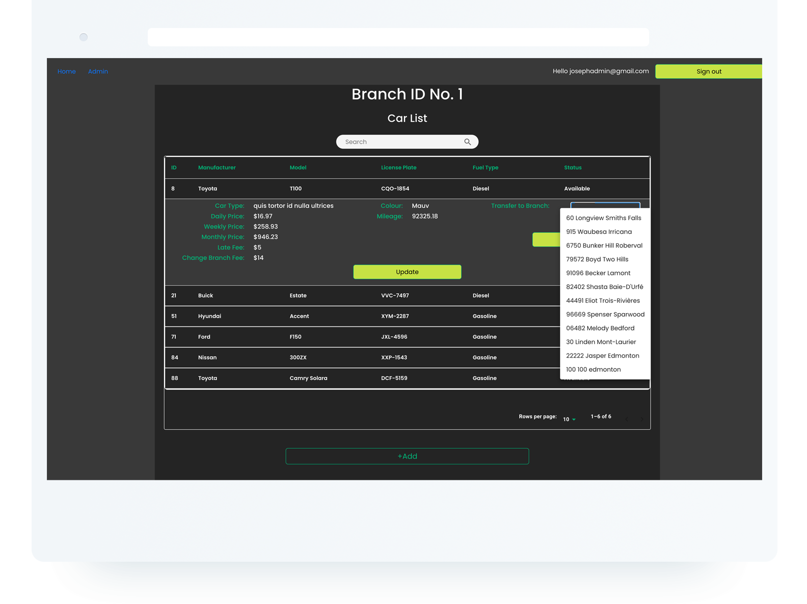There is also an admin interface that users can only access if they provide authentication credentials for an admin upon login. For each branch table created in the database, admins can process rental reservations and calculate any late fees upon return of vehicles. Admins can also update car information, transfer cars between branches and maintain a list of customers.