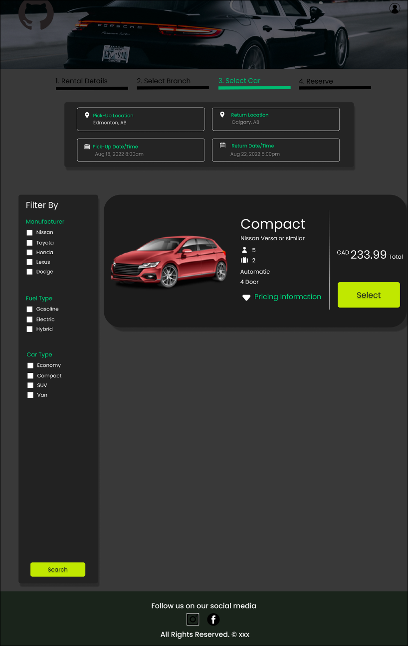 Client users can search for available cars between certain dates and certain branches. Once results are returned, users can filter through by certain criterias such as manufacturers, fuel type or car type. There is a gold star membership system that grants members certain perks such as free upgrades when a criteria is met. Once a reservation is created and a database change is made, the client interface dynamically changes.